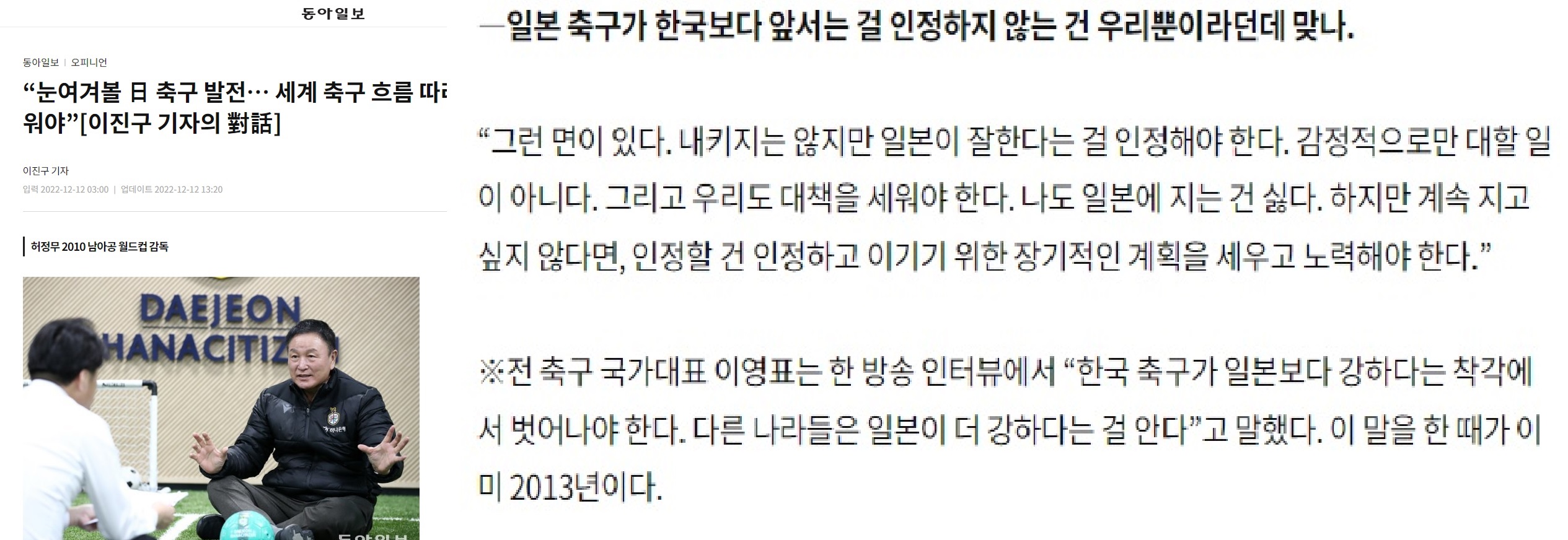 ※元サッカー国家代表のイ・ヨンピョは、ある放送のインタビューで「韓国サッカーが日本より強いという錯覚から脱しなければならない。他の国々は日本の方が強いということを知っている」と話した。このように話したのが2013年だ。- 994