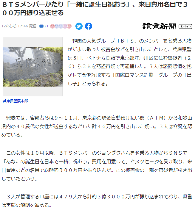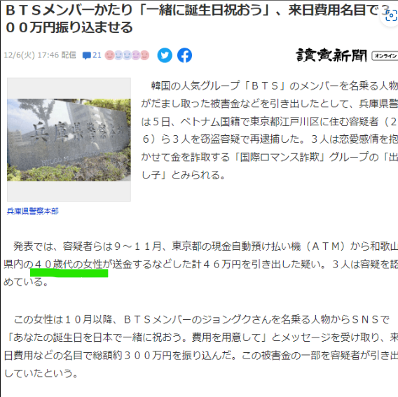 일본여자들 BTS 정국 사칭에 속아서 3억엔 입금