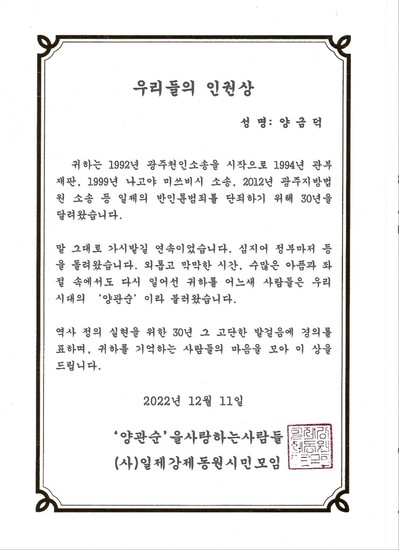 強制動員被害者を支援するイム・ジェソン弁護士は7日、ソーシャルメディアで「外交部がヤン・クムドクさんの叙勲について『事前協議が必要な事項』という意見を出した事実を確認した」とし、「大統領が、強制動員問題で30年間戦ってきた被害者に賞を与えたら日本側が不快に思うことを恐れ、現在議論されている強制動員関連の韓日協議に影響を与えることを懸念して、外交部側との協議が必要だと言っているとしか思えない」と批判した。