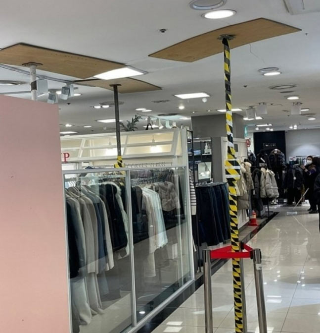 デパート関係者は中央日報に「湿気によって天井が垂れ下がる現象が発生して亀裂が生じたようだ」とし「人命被害はなかった」と説明した。