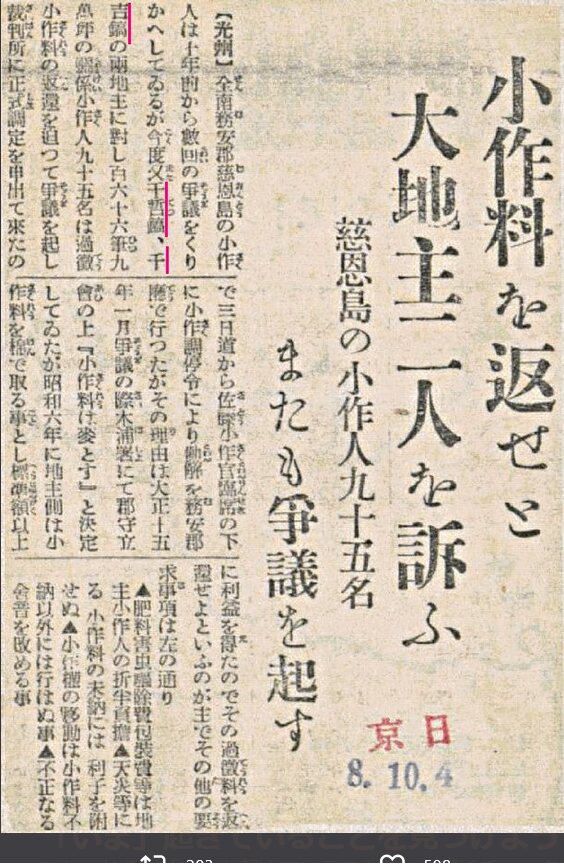 全羅南道の小作人95人が大地主を相手に裁判所に訴え出たという記事。訴えられた大地主は朝鮮人地主(千哲鎬・千吉鎬)、