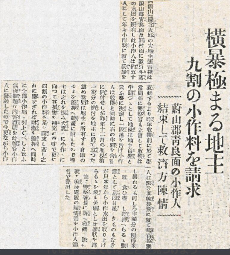 朝鮮人大地主 張吉相が小作人から9割の小作料を請求し、小作人らが警察署長に訴え出たという記事。