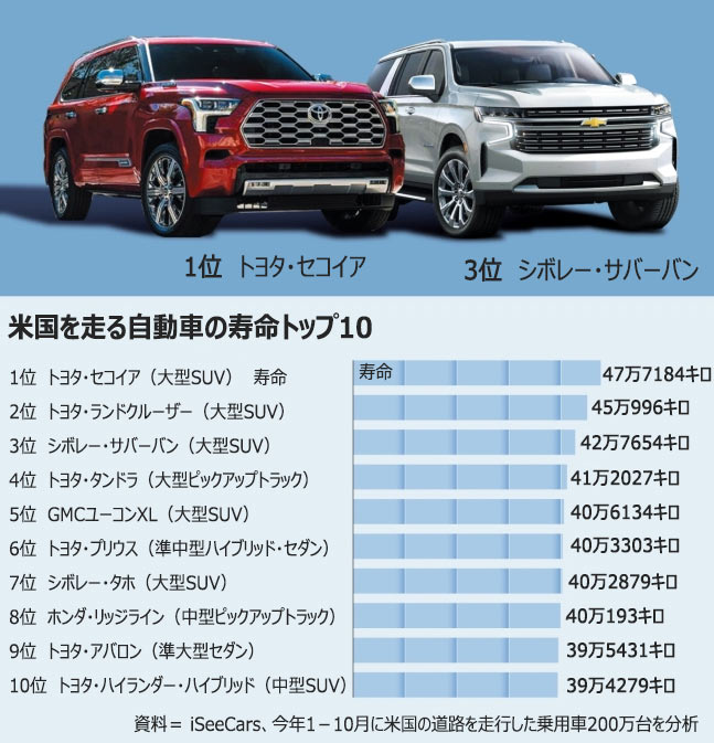 米国中古車分析機関であるアイ・シー・カーズ(iSeeCars)は、今年1-10月、米国の道路を走った自動車200万台のうち、累積走行距離が長い上位1%の車種を分析した。その結果、寿命が最も長いモデルの1、2位は、トヨタの大型SUVであるセコイアとランドクルーザーだった。