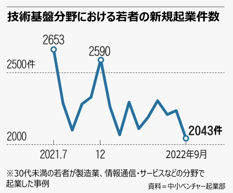 韓国中小ベンチャー企業部(省に相当)が11日に明らかにしたところによると、今年9月時点で年齢30歳未満による技術基盤の起業件数は2043件だった。これは2020年2月(2042件)以来2年7カ月ぶりの少ない数だ。大学などを中心に高まっていた起業ブームが一気に冷めたことが影響している。昨年まで首都圏のある大学で経営学科の先輩後輩たちと共に服のレンタル会社設立を目指していたカンさん(27)も最近は廃業を準備している。2020年に3億ウォン(約3100万円)の投資を受け事業を始めたが、昨年末から投資家たちが新たな投資に応じなくなったためだ。