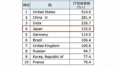 世界109カ国のIT技術者数は約2,517万人、日本は第4位