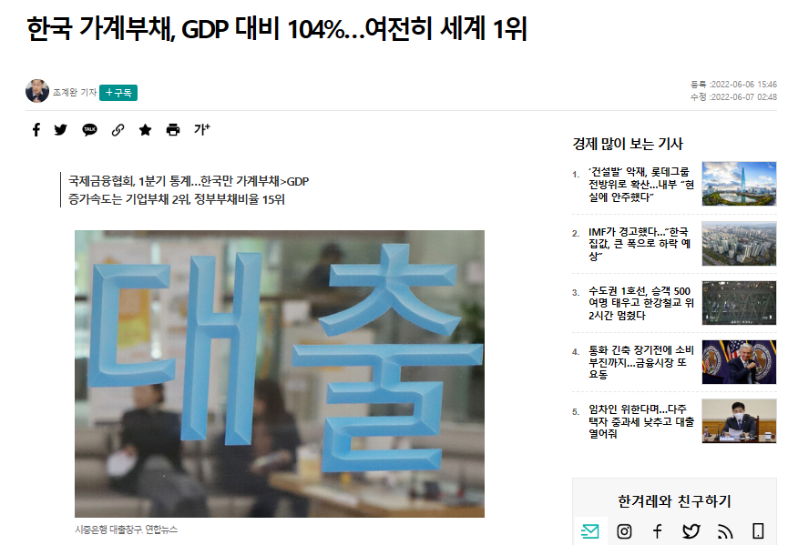 韓国の家計負債、GDP比104%…相変わらず世界1位