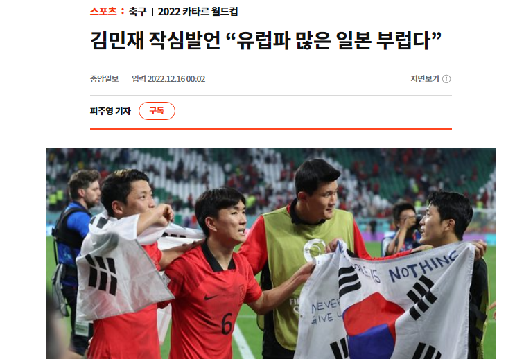 W杯カタール大会に出場したキム・ミンジェは韓国が12年ぶりにベスト16に進出するのに力を加えた。キム・ミンジェは今大会を最後に韓国を離れたベント監督(ポルトガル)が後に韓国選手を迎え入れる可能性に対する質問を受けると「選手らを多く連れていけば良いがそれは容易でない。事実韓国で欧州進出は厳しい」とした。その上で「チームと解決すべきことが多い。移籍料も高い。今回Kリーグの選手もW杯で活躍した。チームの立場でなくむやみに話すことはできないが、あえて一言言うなら欧州チームから提案が来たら快く送り出せば良い」と話した。