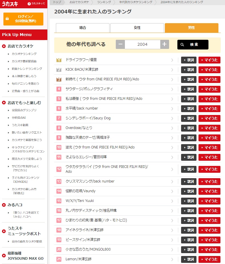 将来の遠征売春婦か?JOYSOUND 年代別カラオケランキング 直近データ(6/13)