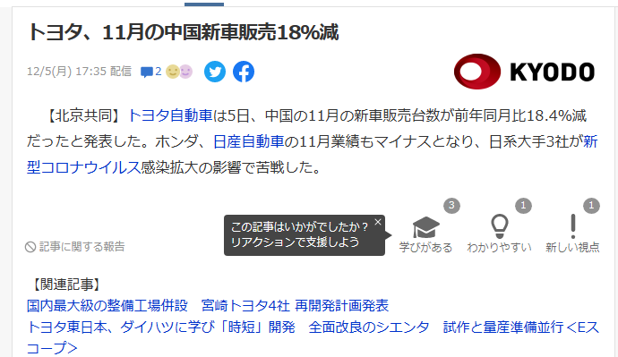 トヨタ自動車の11月の販売台数は前年比18%減>>45