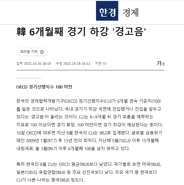 韓国の経済協力開発機構(OECD)景気先行指数(CLI)が6ヵ月連続で基準値(100)を下回ったことが分かった。日本(100.5)、欧州連合(98.6)など主要先進国より低い。 主要国のうち、韓国よりCLIが悪い国は中国(98.0)程度だ。