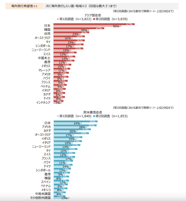 中国、台湾、韓国、米国、英国、オーストラリアなど12地域計6139人に「次に海外旅行したい国・地域」について聞いたところ、アジア、欧米豪ともに日本がトップという結果だった。第1回調査(2020年6月実施)に引き続きアジアではトップを維持し(第1回56%→第2回67%)、欧米豪では順位・割合ともに上昇した(第1回2位24%→第2回1位36%)。