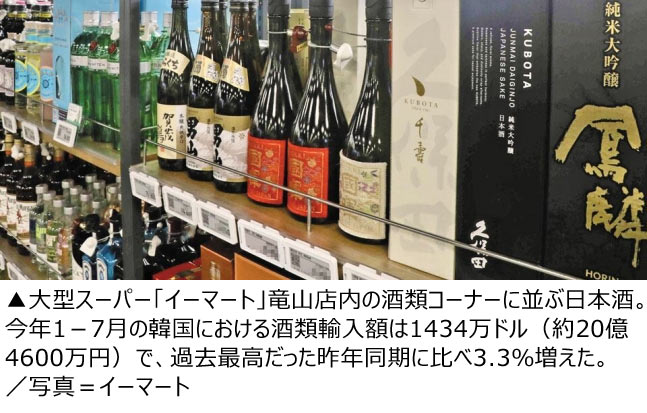 今年(1-7月)におけるビール・ワイン・ウイスキーなどほとんどの酒類の輸入額が前年同期比で一斉に減少している中、日本酒の輸入額は大幅に増え、過去最高を記録した。円安で日本を訪れる韓国人が急増し、日本酒を飲んだことがある人が増え、手ごろな価格の製品も多数輸入されるようになり、日本酒が人気を集めているためとの見方がある。