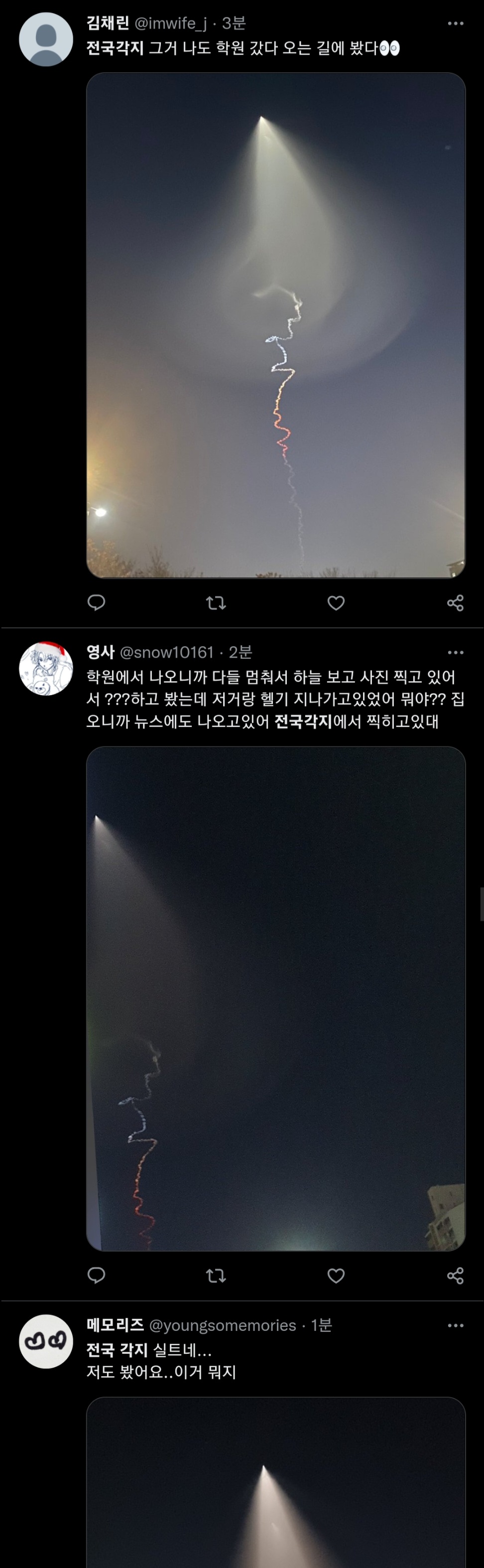 인천시 부평구에 사는 A씨(31)는 "운전하다가 하늘을 봤는데 폭죽처럼 올라왔고 소리는 따로 없었다"라며 "갑자기 밝은 빛이 났다. 마치 조명 같았다"고 전했다.