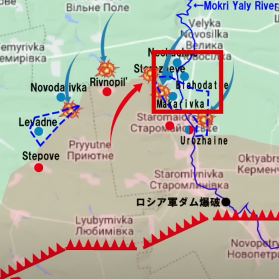 ----------------------「真・防衛チャンネル」によれば、カホフカダムが破壊される前日、ウクライナ軍はヘルソン市で渡河作戦を決行し、東岸に橋頭堡を確保している(17分30秒以降)。