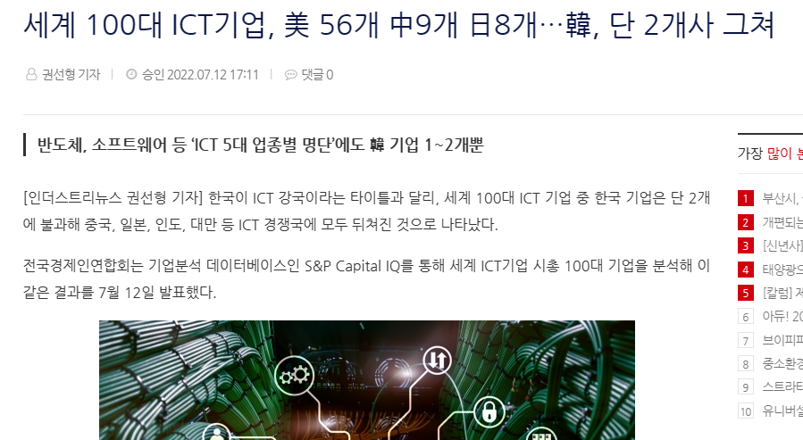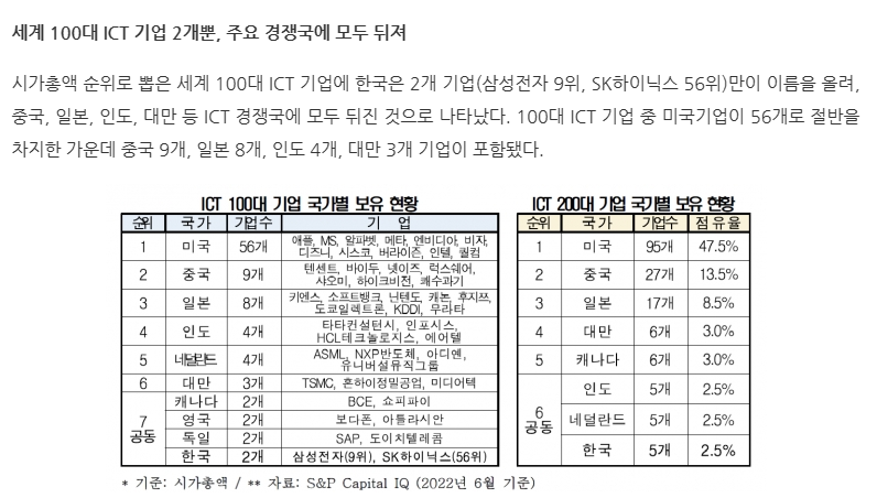韓国はICT(情報通信技術、Information and Communication Technology)大国だと言われているが、世界100大企業のうち韓国企業はわずか2社しかないことが分かった。最も多い国は56社を保有する米国で、中国は9社、日本は8社だった。>>58
