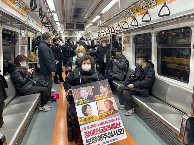 ソウル交通公社(公社)と警察は、発生もしていない電車遅延を理由に警官数百人を投入し、全国障害者差別撤廃連帯(全障連)の地下鉄への乗車自体を全面的に封じ込め、無停車通過まで行った。全障連は、裁判所の調停案にしたがい「5分以内」に乗車を終えるとしたが、公社側は「1分でも遅れると大変なこと」だとするオ・セフン・ソウル市長の強硬対応の基本方針にしたがい、一日中これらの人々の乗車を遮り、むしろ市民の通勤時にいっそうの不便を強いた。それどころか、公社側の安全管理の問題にともなう地下鉄の故障で電車が止まり、新年の出勤初日から遅刻が続出した。