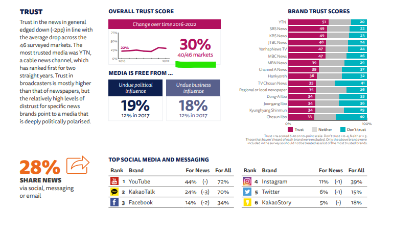 英国オックスフォード大学ロイター・ジャーナリズム研究所が最近発表した「デジタル・ニュースリポート2022」によると、世界の主要46カ国・地域で実施されたメディアに対する信頼度調査で韓国が40位(信頼度30%)で最下位圏