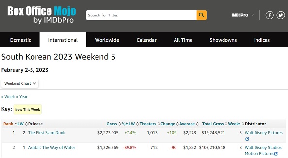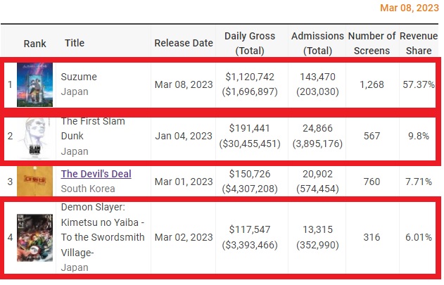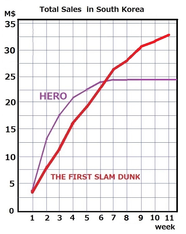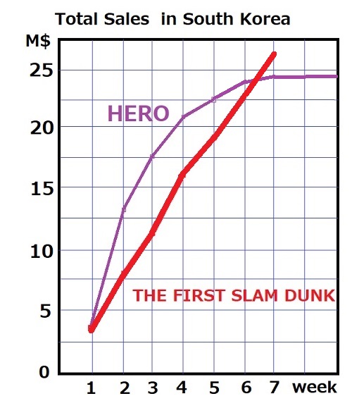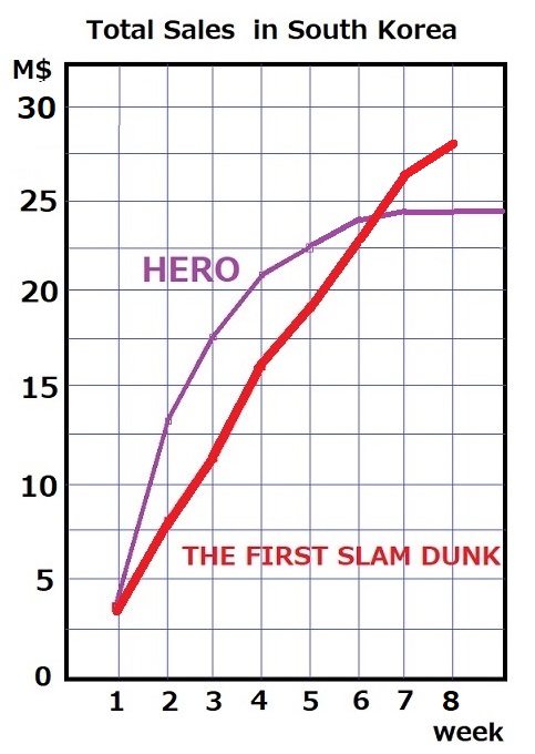 新規公開の韓国映画、公開初週の週末売上で、8週めのスラムダンクに届かず。