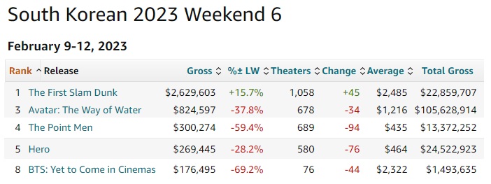 現時点での韓国映画のトップ(全体3位)の「交渉」(The Point Men)は、3週めで ー57%なのにぃ。THE FIRST SLAM DUNK($10,995万以上)日本映画(2022年公開3位)上映中