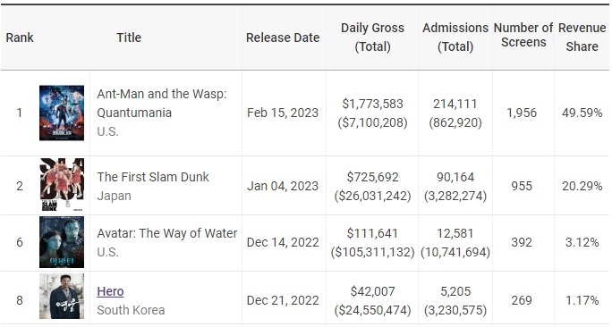 1位は9万1611人を動員した米国SFの「アバター:ウェイ・オブ・ウォーター」で、累積観客数は809万3547人となった。前日まで2位の座を守っていた安重根の人生を描いた韓国のミュージカル映画「英雄」は4万8349人を動員し4位に下落した。