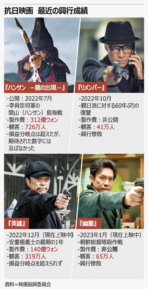 新型コロナウイルス感染拡大前の2010年代は『バトル・オーシャン 海上決戦』『暗殺』『密偵』『鳳梧洞戦闘』=原題=など、日本を敵と設定した映画のほとんどが大きな収益を上げた。例外は『軍艦島』と『隻眼の虎』だけだった。ところが、最近の抗日映画は相次いで無残な興行成績となっており、「映画館街で『無条件の反日』や『ノージャパン(No Japan=日本製品不買運動)』が通用した時代は終わった」という見方が出ている。