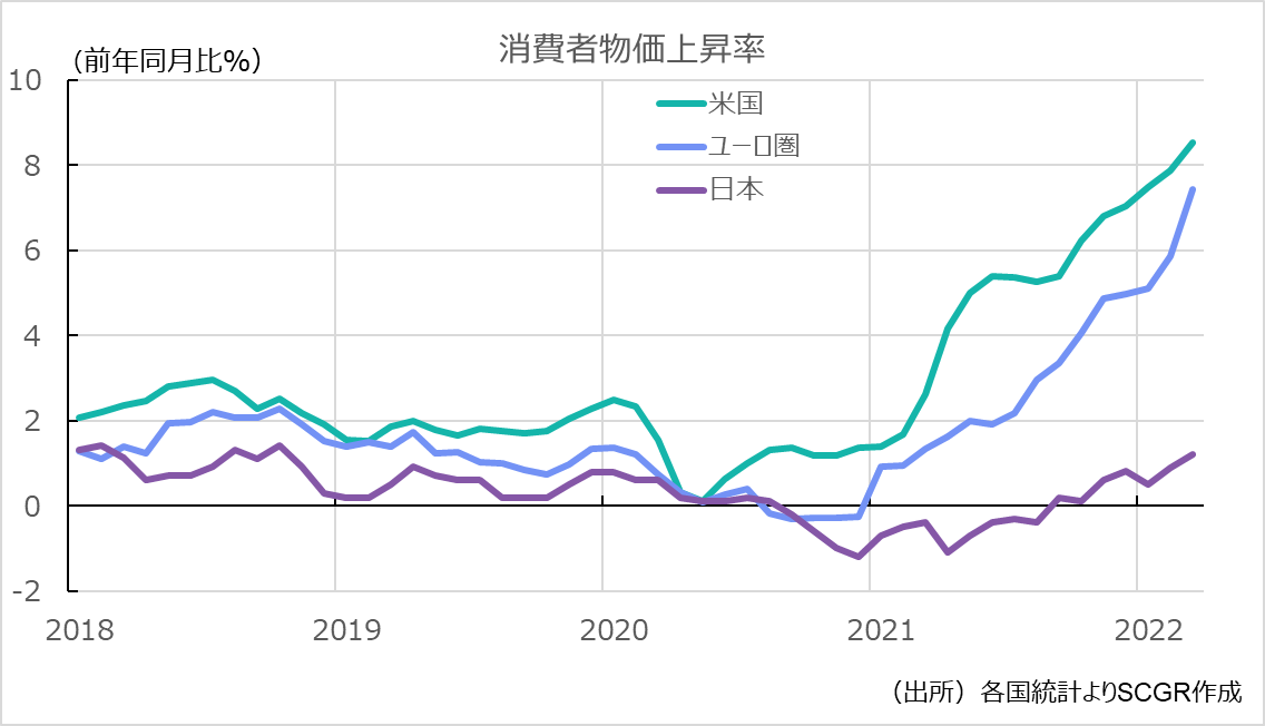 長年デフレに慣れ親しんでしまった日本では、インフレと言われても現実感がありませんが、今、世界はインフレの波に襲われています。消費者物価上昇率は、3月に米国で前年同月比+8.5%と40年ぶりの高さとなり、ユーロ圏でも3月は過去最高の+7.5%。トルコでは4月は実に+70%となりました。日本でも東京都区部では4月に+1.9%と7年ぶりの高水準になっています。