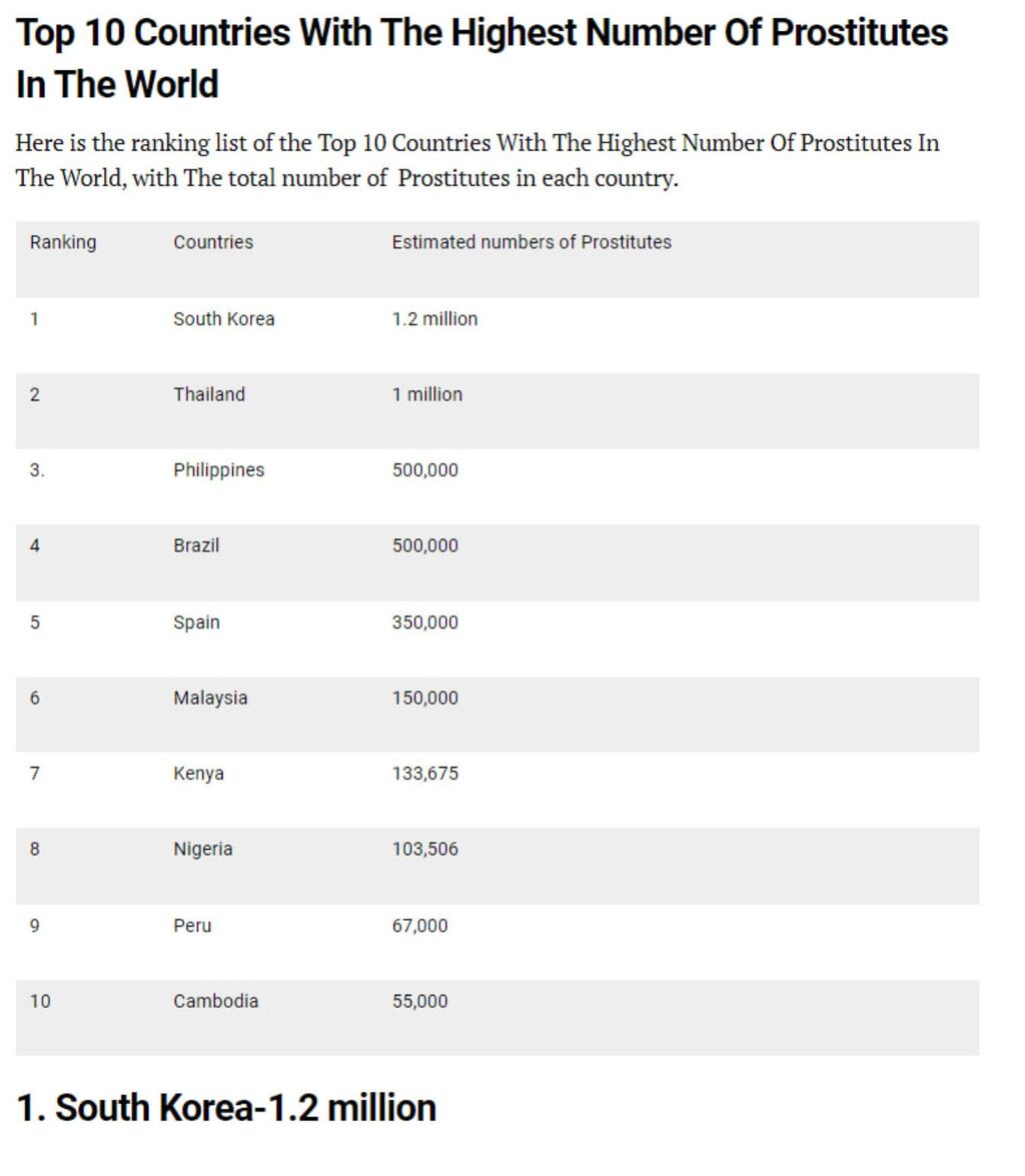 韓国人女性は、なんと10人に1人以上が売春婦。Top10と書いてあるから、日本人売春婦は総数5万人未満。すると最大でも 20未満。日本人女性の場合は、1000人に2人いるかいないか。統計値に出てこない援助交際のような売春婦がいたりして統計基準の差があるとしても、この差は如何ともし難い。日本国籍の朝鮮民族女性を外してしまったら、いったいどれだけの差になってしまうのか?