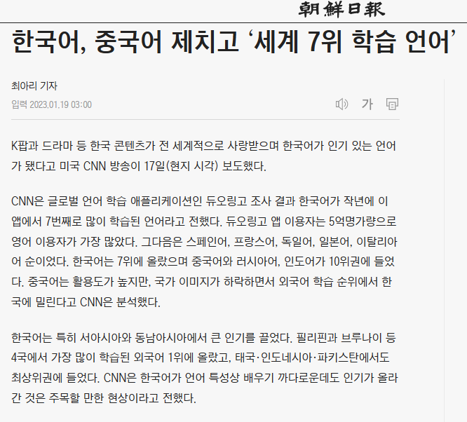 CNNは、過去数十年にわたりアジアの語学学習市場は中国語と日本語に二分されていたが、多くのファンを持つ人気グループ、BTS(防弾少年団)をはじめ、12年のPSY(サイ)の世界的ヒット曲「江南スタイル」、20年の米アカデミー賞で作品賞を含む4冠に輝いた映画「パラサイト 半地下の家族」、21年の米動画配信大手ネットフリックスのオリジナルドラマ「イカゲーム」など強力な成功作によって韓国語が注目を浴びたと評価した。