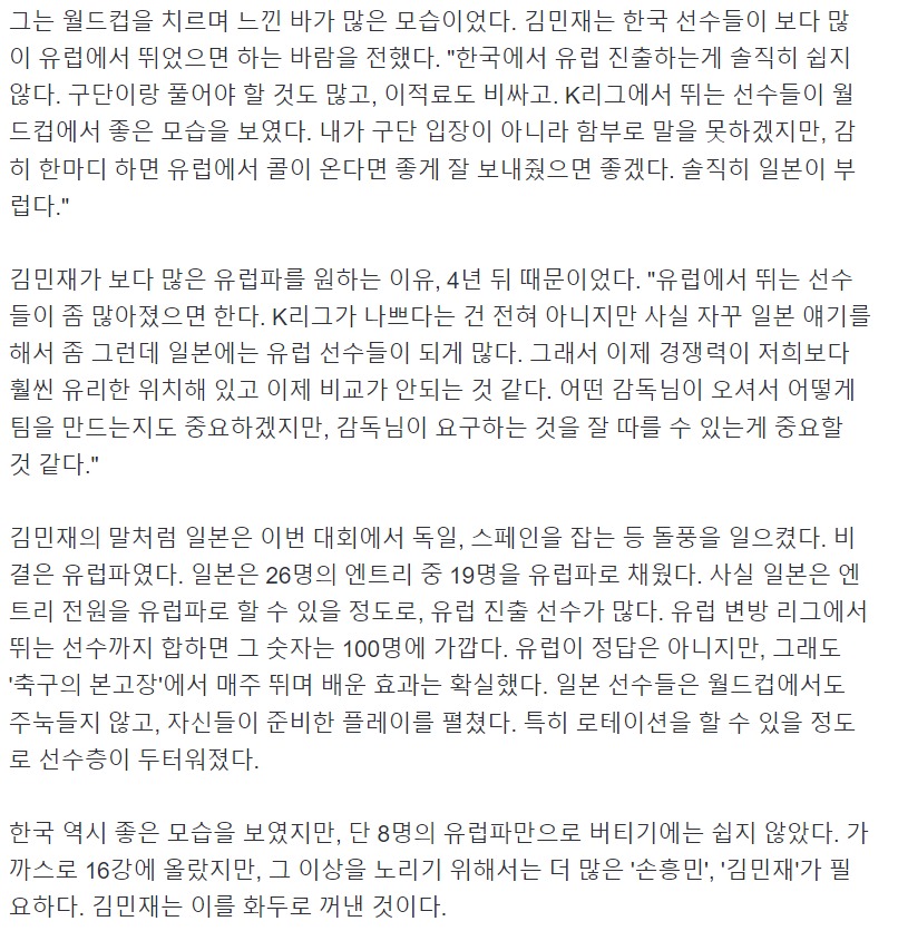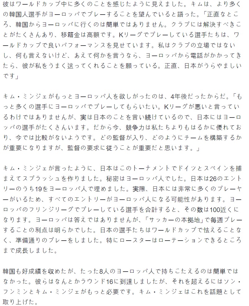 「日本が我々より競争力が優れているのは、欧州に沢山選手が居るから。日本は韓国よりはるかに優れており比較にならない。」ソン・フンミンを引き合いに出して「集団の能力では日本が上だが、個々の能力は韓国人の方が優れてる」ってのが最近の韓国人の言い訳だったのにな。