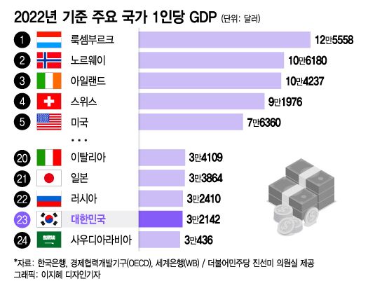 韓銀は、昨年の韓国の1人当たりGNIが人口5000万人以上の国の中では、米国、ドイツ、英国、フランス、イタリアに次いで6位にランクされるだろうと推計している。韓銀のチェ・ジョンテ国民勘定部長は「韓国のGNIは2023年基準でイタリアよりは少ないが、台湾と日本を上回る水準だ。特に日本は通貨価値の下落により韓国より1人当りGNIが少なかった」と話した。