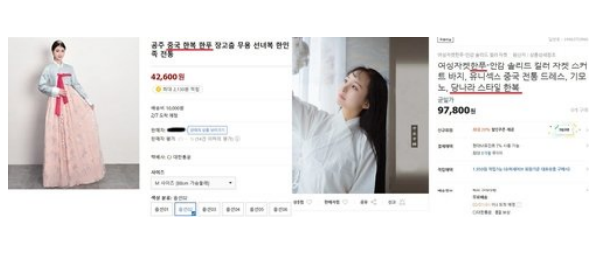 2023年1月16日、韓国・聯合ニュースは「韓国の有名ネットショッピングモールで、韓国の伝統衣装『韓服』が、中国の『漢服』として紹介されている」と伝えた。