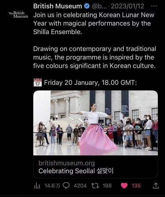 ロンドンにある大英博物館は「今月20日に韓国の伝統舞踊公演イベントを博物館で開く」として、今月12日から博物館の公式ホームページとツイッターで広報してきた。博物館側はこの過程で、今回の旧正月イベントを「韓国の旧正月(Korean Lunar New Year)」と書いた。また、「Celebrating Seollal(ソルラル=韓国語で元旦=を祝う)」という説明も付けた。