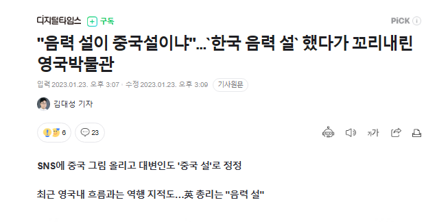 英国ロンドンの大英博物館が旧暦の新年を迎え、「韓国の旧暦のお正月」を記念する行事広報ツイートを掲載し、中国人の不満を買った。 彼らは「韓国の旧暦説」を「中国説」と表記しなければならないとして抗議ツイートを列挙し、結局大英博物館は該当ツイートを削除した。