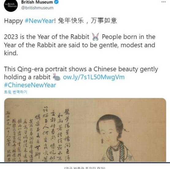 結局、大英博物館は22日のツイッターに中国人女性がウサギを抱えている清時代の絵を掲載し、「中国の正月(Chinese New Year)」と書いた。また、「私たちは国内で、あるいは世界的に中国の正月を記念している」という内容のコメントも発表した。「韓国の旧正月という表現の削除は妥当なのか」という本紙の質問に、同博物館側は「特に言及すべき内容はない」と答えた。>>160