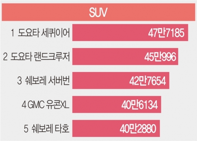 セダン・ハッチバック部門1位はトヨタ・アバロンだった。 アバロンの潜在寿命は39万5432キロに達した。 2位は米国シボレーインパラ(37万701キロ)だった。 続いてホンダアコード(36万3982㎞)、トヨタカムリ(35万9284㎞)、レクサスGS350(33万4412㎞)の順だった。 ビジュアルキャピタリストは「プレミアムブランドの中で唯一レクサスが含まれているのはトヨタと共有する部品が多いからだろう」と分析した。