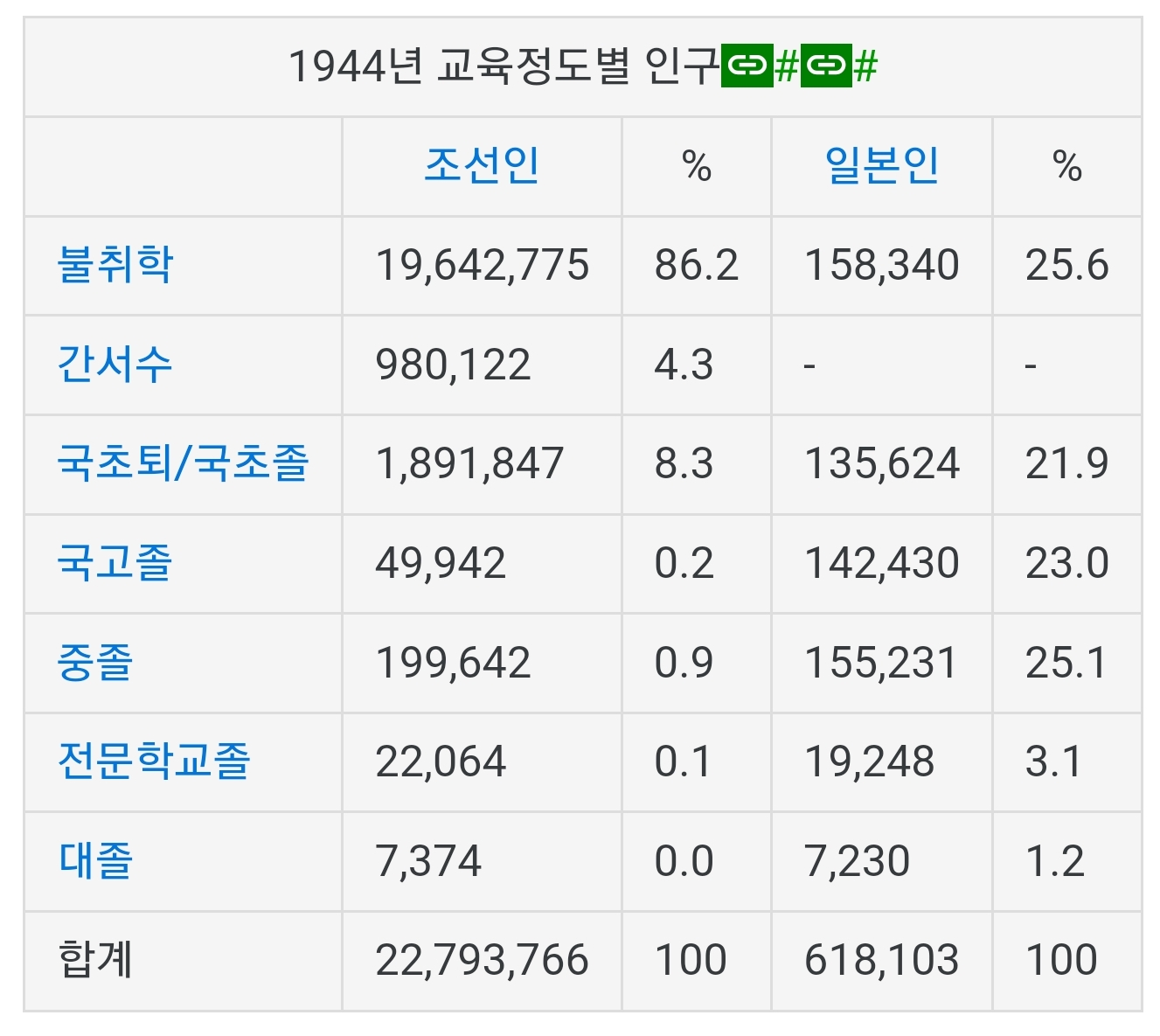 そもそも日本が統治する前の朝鮮人は、日本人を遙かに下回る状況なのに、どうしてたかが40年で追いつくんだ?w일제는 처음부터 조선인들에게 고등교육처럼 문명화된 지식인 양성 교육을 시킬 생각이 없었다. 일제는 식민지 운영에 필요한 정도의 조선인 인력이 필요했지, 고급 조선인 인력은 오히려 독립을 불러올 수 있으므로 조선교육령의 반포하에 조선인들에게 초중등교육 및 실업교육을 보급하는 데 주력했다.