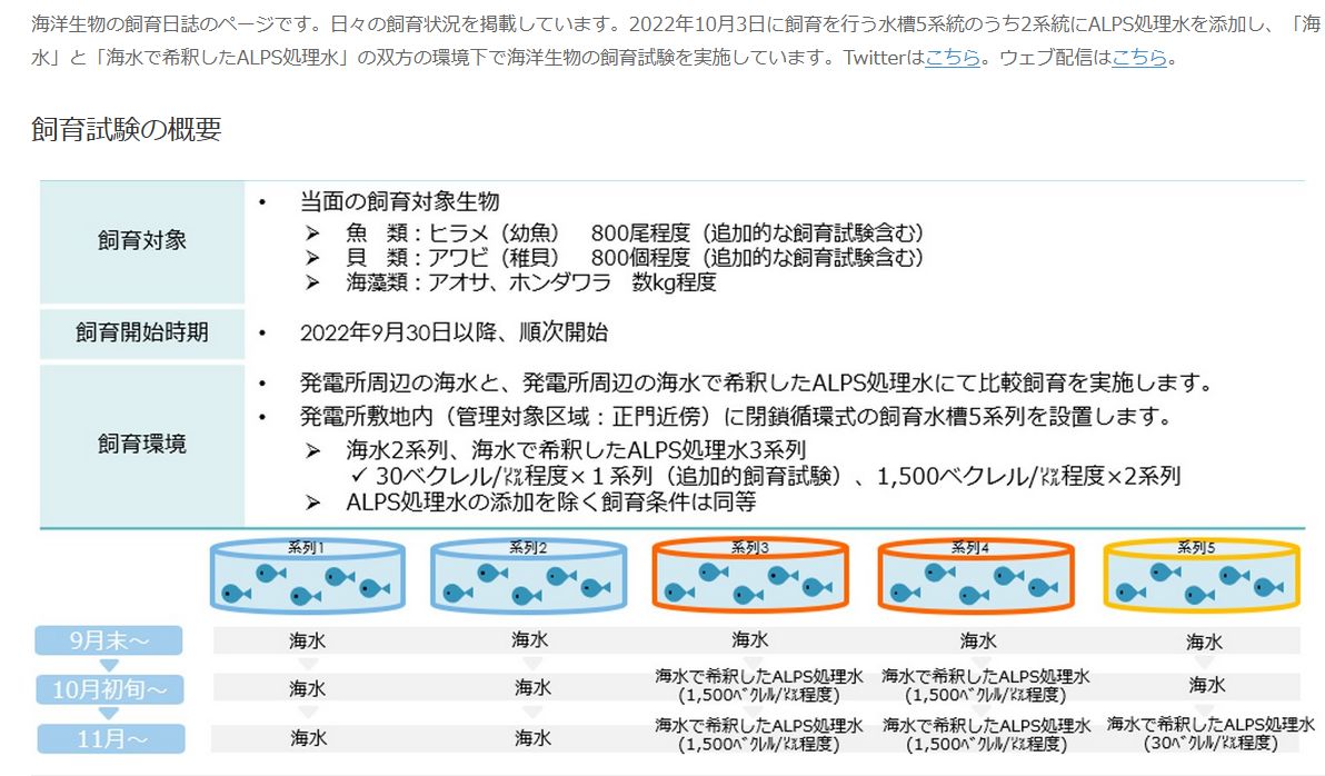 2022年10月3日に飼育を行う水槽5系統のうち2系統にALPS処理水を添加し、「海水」と「海水で希釈したALPS処理水」の双方の環境下で海洋生物の飼育試験を実施しています。