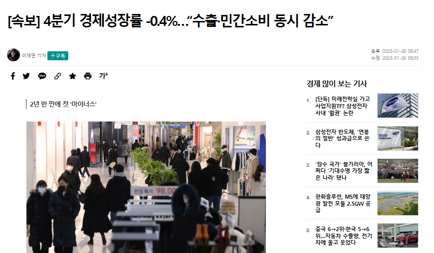【速報】第4四半期の経済成長率-0.4%…「輸出·民間消費同時減少」