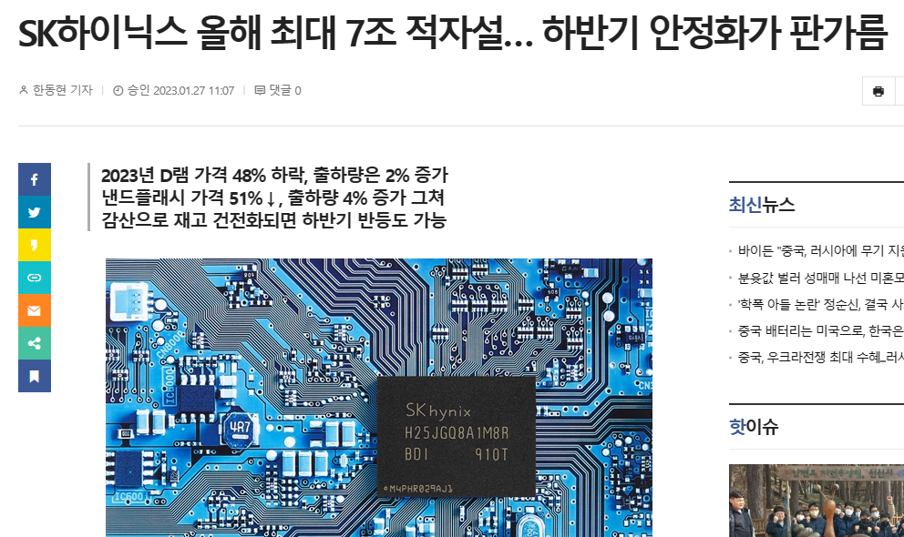 SKハイニックスはこの日、昨年10-12月期に1兆7012億ウォンの営業赤字を出したと公示した。四半期基準で2012年7-9月期の240億ウォンの赤字から10年ぶりの赤字記録だ。サムスン電子の営業利益は前年同期比97%急減した2700億ウォンにとどまった。