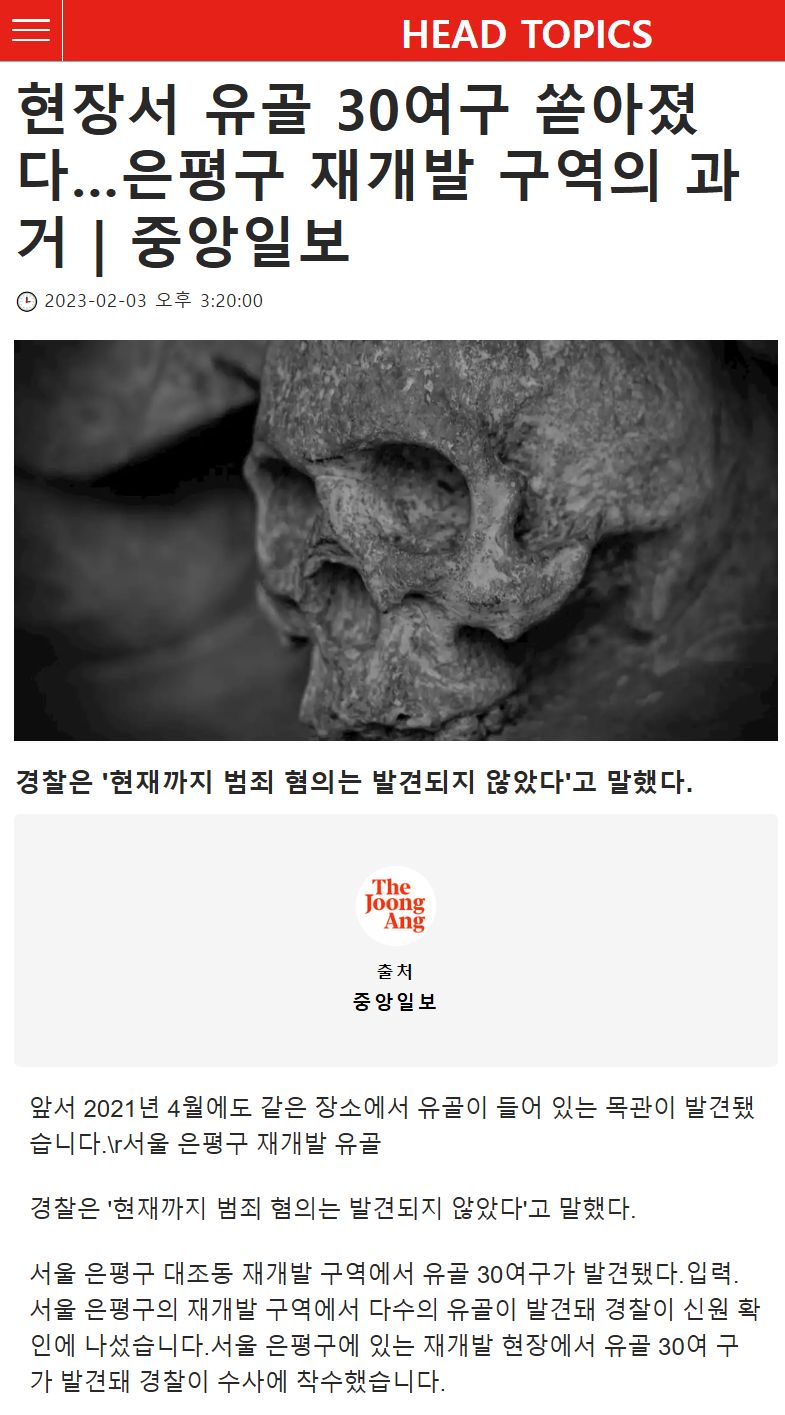 3日、ソウルウンピョン警察署によると、前日午後2時30分頃、大城洞対照1区域再開発現場で遺骨30余区が出た。 関係者は「昨年もこの地域で遺骨が発見されるなど、同様の事例が出続けており、過去にこの地域が墓地だったと推定される」とし、現在まで犯罪疑惑は発見されていないと説明しました。警察は発見された遺骨が文化的 価値があるのか遺跡調査団の検証が終わり次第、現場で遺骨を収拾して身元確認手続きを経る予定だ。