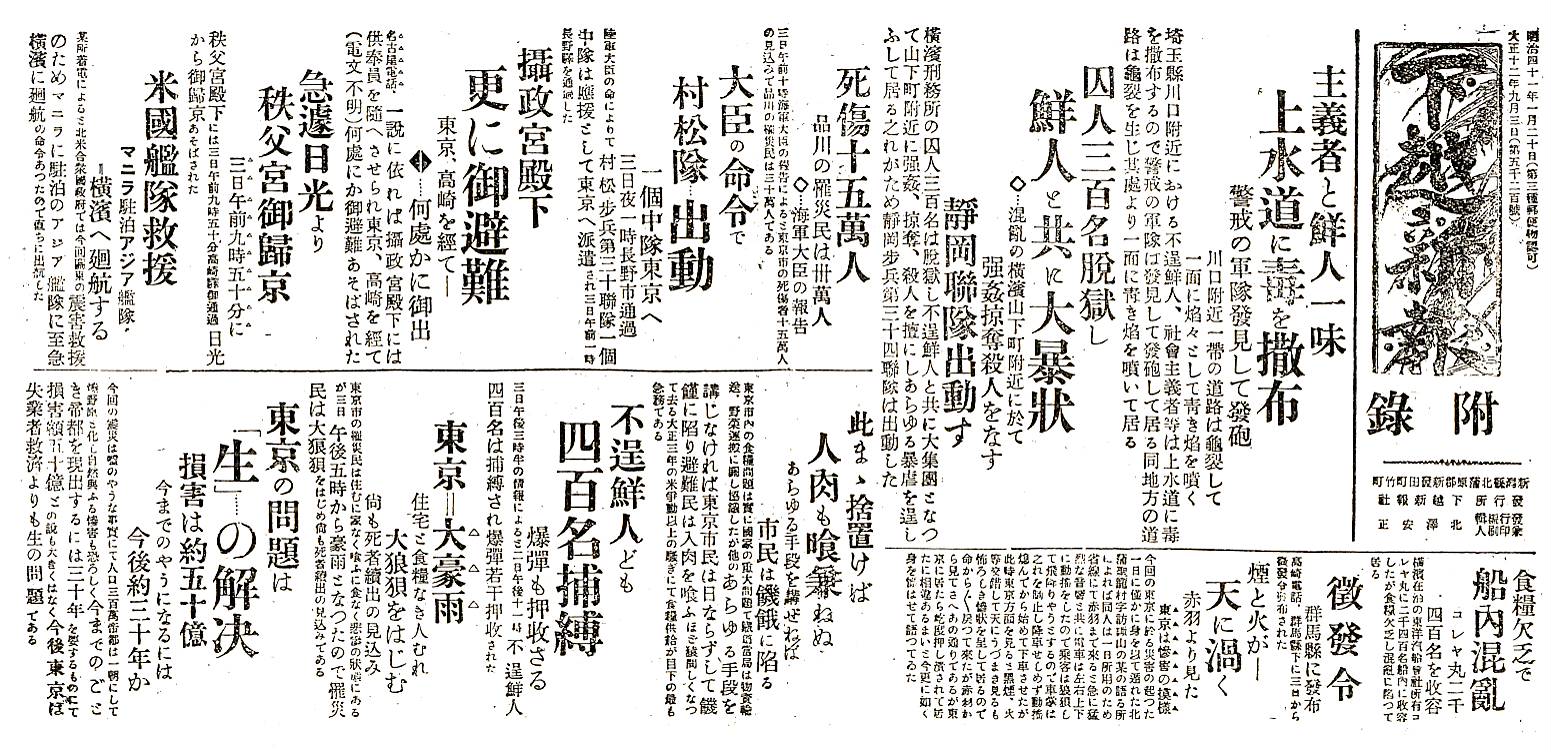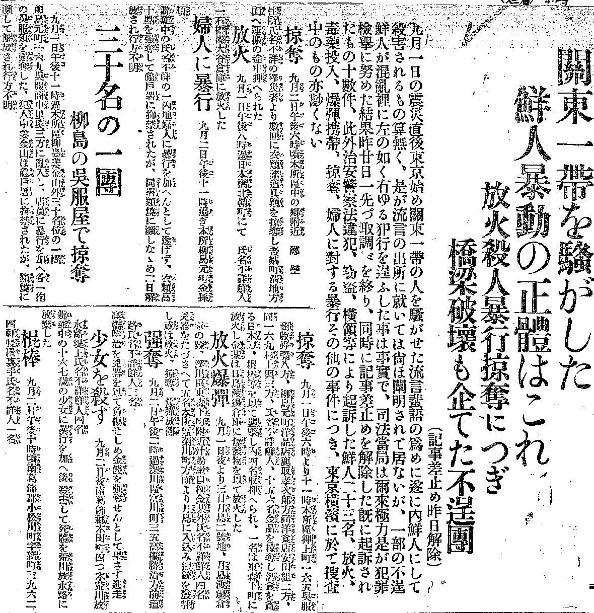 自警団による自衛行為はやめさせてこの混乱を収拾させるべきだ」と考え、報道規制をして風評の打ち消しに徹した。