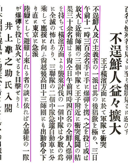 況んや不逞の鮮人約二千は腕を生んで市中を横行し、略奪を擅にするは元より、