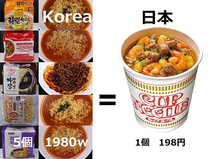 日本のレンジでチンのご飯パック1個の値段で、韓国でインスタント袋麵が4個買える。