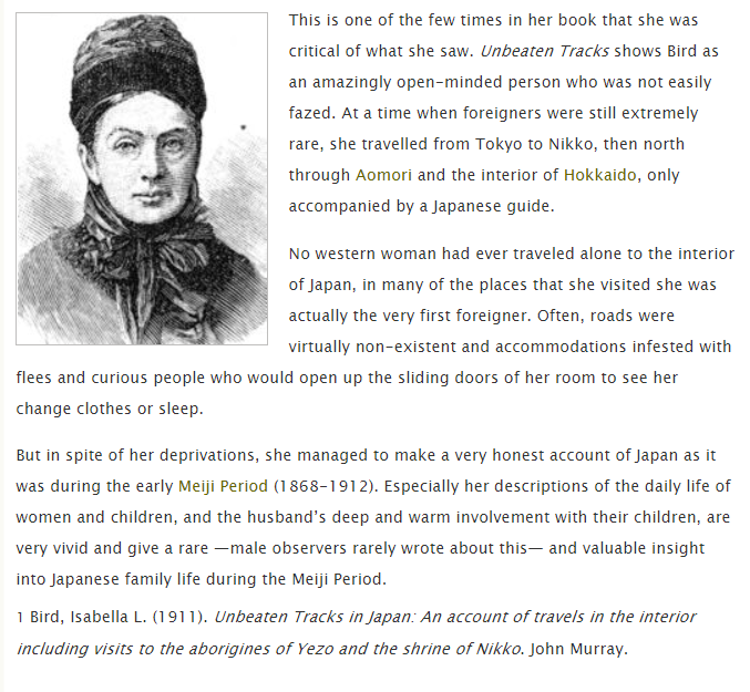またナムwikiからコピーしたのか?☺️"매우 활기찬 여성이 가슴을 드러낸 채 시골길에서 짐을 나르고 있다. 시골 여성들은 이처럼 일하면서 몸을 흔히 노출시킨다. 남성들은 loincloth 만 두른다.[32] 이건 심지어 도시에서도 이렇다. 특히 노동자 농민 계층에서 그렇다. 서양인 여행자라면 이런 누드 풍습에 큰 충격을 받는다. 일본의 깊숙한 안쪽을 들어가보고 나는 충격을 받았다. 다른 여행서들에서는 이런 부분을 보여주지 않았기 때문. 남성들은 거의 아무 것도 입지 않았고, 여성 일부는 여기저기 뜯어진 짧은 속치마만 걸치고 위에는 헐렁한 옷을 걸쳤는데 허리까지 드러내고 끈으로 묶었다. 그렇게 입는 데는 무슨 성적인 의미는 없었다. 짧은 속치마는 매우 야만적이었다. 나의 '문명화된 일본'이란 선입견으로는 도무지 믿을 수 없는 장면이었다."