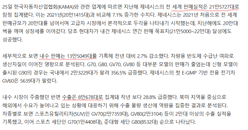 詳細に見ると、内需販売は13万5049台を記録し、前年比2.7%減少した。 車両用半導体の需給難の影響で生産支障が続いた影響と分析される。 G70、G80、GV70、GV80など大部分のモデルの販売が減少したが、新型モデルが発売されたG90の場合は国内で2万3229台が販売され、356.5%急増した。 ジェネシス初のE-GMPベースの専用電気自動車GV60は5639台が売れた。
