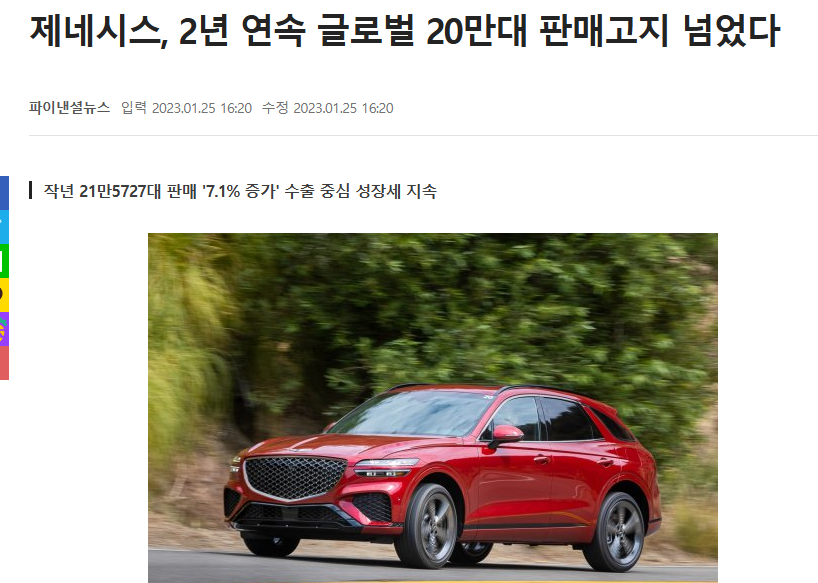 25日、韓国自動車産業協会(KAMA)と関連業界によると、昨年ジェネシスの世界販売実績は21万5727台と暫定集計された。 これは2021年(20万1415台)に比べて7.1%増加した数値だ。 ジェネシスは2021年に初めて世界販売規模が20万台を超え、高級車市場で本格的に頭角を現し始めたが、昨年も20万台の壁を破って成長を続けた。 当初、現代自動車が掲げたジェネシスの年間販売目標値(21万5000~22万台)の達成にも成功した。