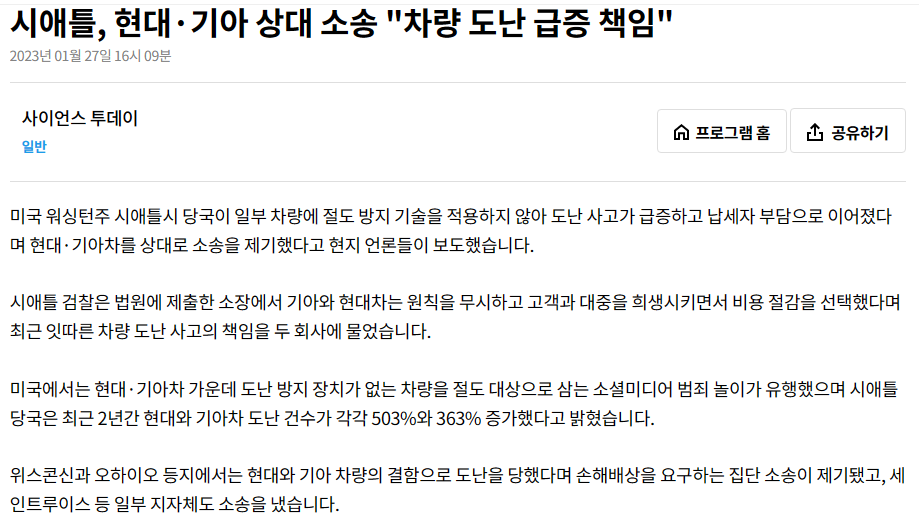 シアトル、現代·起亜を相手取って訴訟「車盗難急増の責任」Www