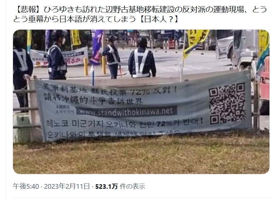 辺野古反対派の垂れ幕“中国語とハングルだらけ” ひろゆき氏「隠さなくなって来たんですね」