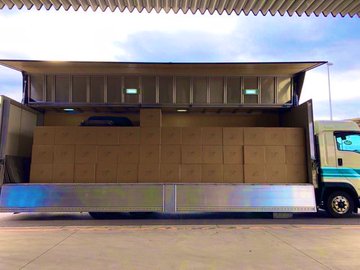 そこで、ここで全国各地から送られた救援物資を集めているのですが、宅配箱をいっぱい積んだトレーラーが早朝から入ってきています。