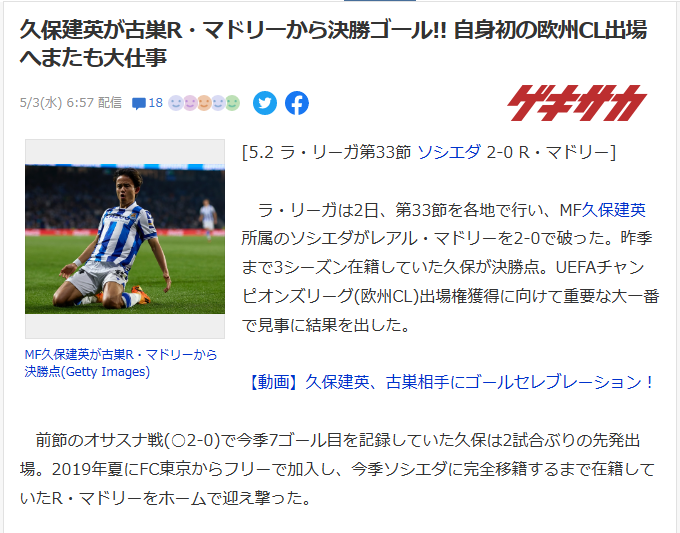 https://news.yahoo.co.jp/articles/fd0ad12286048e8c9eed639b0793aa1caecdf323レアルソシエダ 2 - 0 レアルマドリード